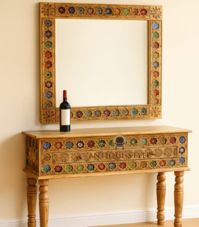Elevate your hallway, living room, or boutique space with this luxurious Hand Carving Brass & Tile Fitting Console Table. Crafted from premium solid wood, the console features beautifully hand-carved detailing, brass inlay work, and artistic ceramic tile fittings that together create a stunning statement piece. With its rich craftsmanship and elegant silhouette, this console table adds charm, class, and cultural artistry to any interior.