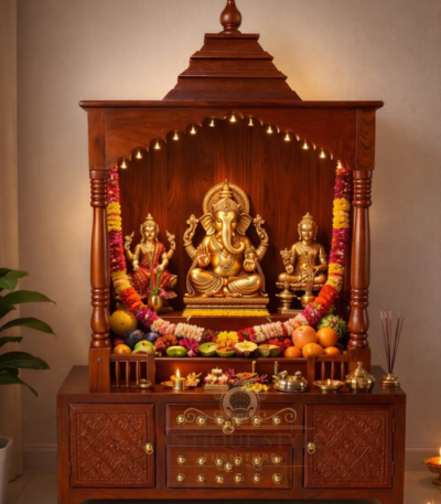 This handcrafted wooden temple from Antique Style Furniture showcases timeless Indian artistry and spiritual elegance. Made from premium-quality solid wood, it features rich finishes, traditional carvings, and a beautifully designed dome structure. The spacious sanctum is ideal for placing idols, diyas, and offerings, while the lower drawers provide convenient storage for puja essentials. Perfect for homes seeking devotion blended with classic antique aesthetics.
