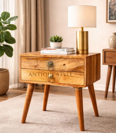 This solid wood bedside table from Antique Style Furniture combines functionality with timeless design. Crafted from high-quality natural wood, it features a smooth finish that highlights the natural grain and adds warmth to your bedroom. The table includes two spacious drawers with elegant brass ring handles, offering convenient storage for daily essentials. Supported by sturdy tapered legs, this bedside table is perfect for modern, classic, or antique-style interiors.