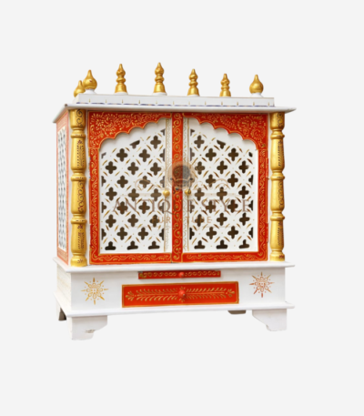 Invite divinity and elegance into your home with this beautifully handcrafted wooden temple. Designed to be a sacred sanctuary for your daily prayers, this Mandir combines vibrant traditional aesthetics with practical storage solutions.