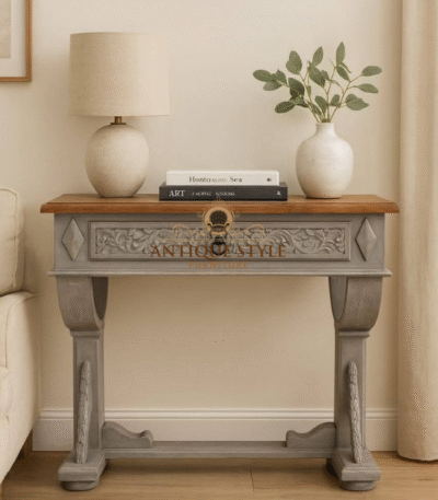 The Mango Wood Carved Console Table brings French Country elegance and timeless charm to your hallway or living room. Crafted from solid Mango Wood with a distressed grey or sage finish and a smooth natural wood top, it features a hand-carved drawer, sculptural pedestal legs, and antique-style hardware. Perfect for storing small essentials and displaying décor, this console combines classic sophistication with practical functionality for transitional, traditional, or French Country-inspired interiors.