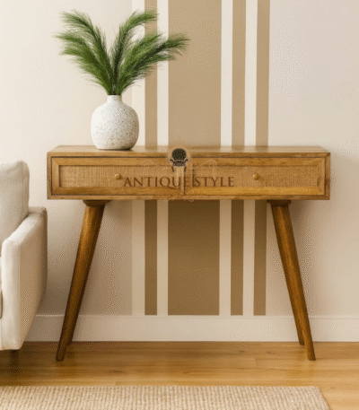 The Mango Wood & Rattan Console Table anchors your entryway or hallway with timeless Mid-Century charm. Crafted from solid Mango Wood with a warm, natural finish, it features two spacious drawers with hand-woven rattan fronts, combining style and functionality. Iconic tapered legs lift the piece, while minimalist brass-toned knobs add subtle elegance. Perfect for organizing keys, mail, or small essentials, this console table blends Mid-Century Modern, Scandinavian, and Bohemian aesthetics seamlessly.