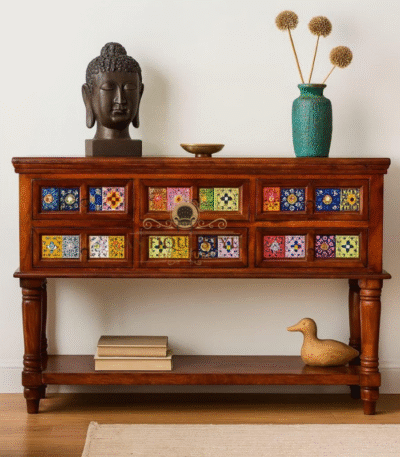 The Mango Wood Tile Fitted Console Table brings vibrant color and artistic charm to any entryway or living area. Crafted from solid Mango Wood with a rich brown finish, it features eight drawers inlaid with hand-painted ceramic tiles forming a lively mosaic. A spacious lower shelf and sturdy turned legs provide functional display and stability, making this console table a festive, practical, and eye-catching addition to Bohemian, Ethnic, or Coastal-inspired interiors.