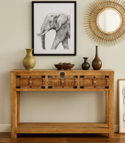 The Heritage Mango Wood Console Table blends ethnic charm with functional elegance, making it a standout addition to any entryway or living space. Crafted from solid Mango Wood with a warm natural finish, it features three drawers accented with brass-toned hardware and a spacious lower shelf for display. Sturdy legs and a refined silhouette provide durability and style, perfectly complementing Bohemian, Transitional, Rustic, or Ethnic-inspired interiors.