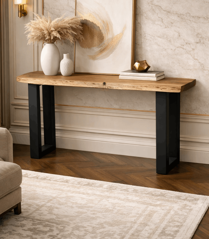 Bring the raw beauty of the outdoors inside with our Akasya Wood Live Edge Console Table. Each table features a solid slab of premium wood, meticulously hand-finished to preserve its natural “live edge”—the organic curves and unique grain patterns of the tree itself. Balanced by bold, minimalist industrial metal legs, this table is a masterpiece of contrast. It’s not just a piece of furniture; it’s a functional work of art that adds warmth, character, and a modern rustic edge to any space.