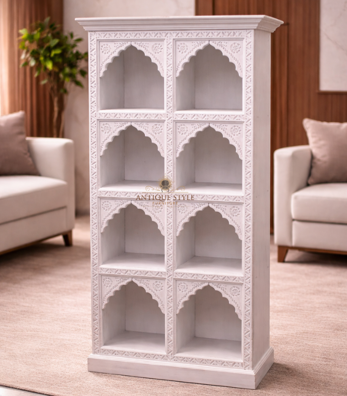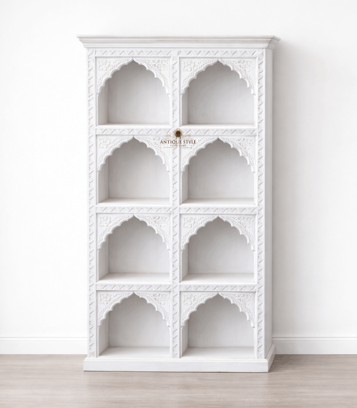 Bring home a blend of architectural beauty and functional storage with our Hand-Carved Mehrab Design Book Shelf. Inspired by classic Mughal and Indian palace architecture, this bookshelf features eight beautifully symmetrical compartments, each framed by a stunningly detailed arched (Mehrab) carving. Its pristine white distressed finish adds a touch of “Shabby Chic” elegance, making it a perfect fit for modern, vintage, or classic home decors. Whether you use it to display your favorite book collection, curated artifacts, or indoor plants, this piece serves as a majestic focal point that radiates sophistication and charm.