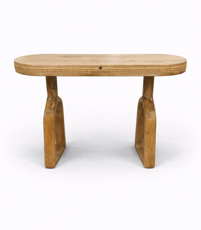 Elevate your home decor with this uniquely architectural Cane Designed Wooden Console Table. Featuring a sleek, pill-shaped tabletop accented with a delicate woven cane border, this piece stands on two bold, hollow-arch wooden pedestals. Its light honey-toned finish and minimalist silhouette make it a versatile statement piece that seamlessly bridges the gap between modern design and traditional craftsmanship.