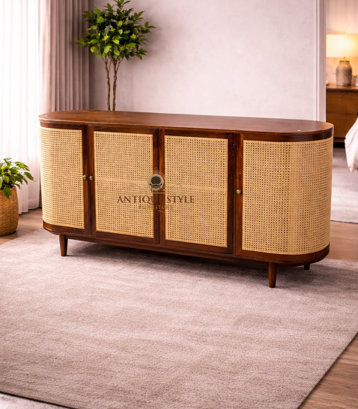 • Four-Door Cane Artistry: Showcases four large cabinet doors inlaid with high-quality woven cane, offering a unique textural contrast and a breathable design for electronic components.