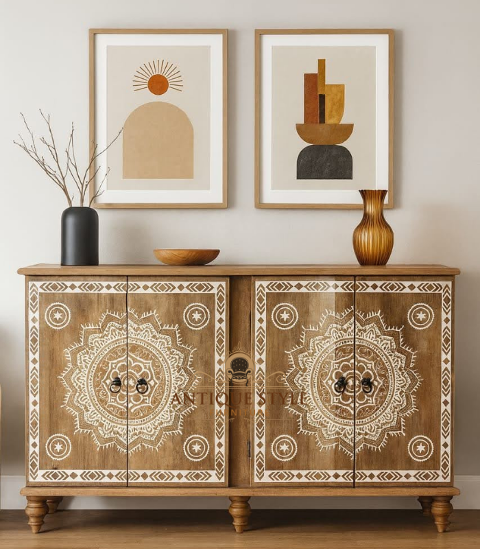 This impressive sideboard showcases enduring craftsmanship with deep floral and foliage carving across its entire façade. Crafted from solid Mango Wood in a warm natural finish, it radiates rustic elegance and exotic charm. With three spacious storage compartments and ornate detailing, it serves as a striking centerpiece for living rooms or dining spaces that embrace timeless artisanal beauty.