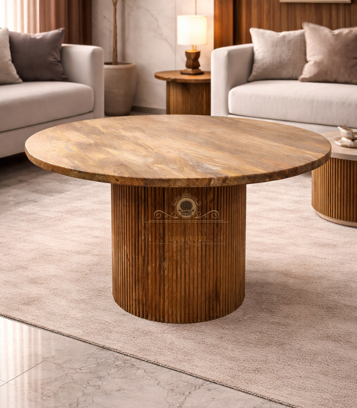 Create a captivating dining experience with this solid Mango Wood Dining Table. Featuring a perfectly circular top resting on a grand, fluted pedestal base, this table is a masterclass in texture and geometric design. Its honey-toned natural finish and robust construction make it a timeless addition to your home, offering a communal and inviting atmosphere for everything from daily meals to elegant dinner parties.