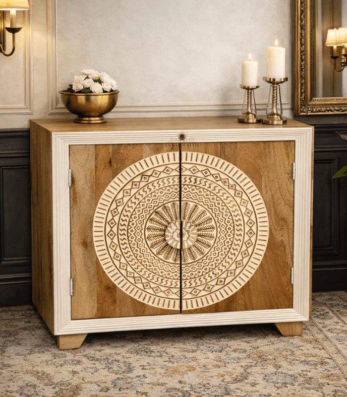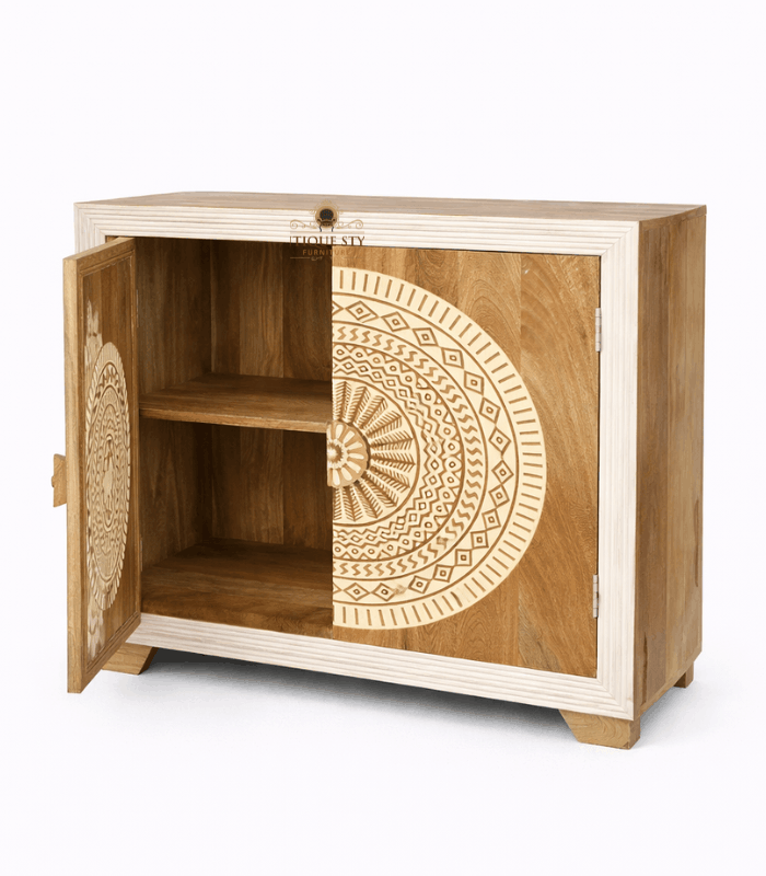 Add a touch of bohemian elegance to your living space with this exquisite Mango Wood Hand-Carved Sideboard. This cabinet is a true masterpiece of craftsmanship, featuring a stunning, large-scale Mandala circular motif hand-carved across the two front doors. The contrast between the natural warm wood tones and the intricately detailed white-washed carving creates a captivating focal point for any room. With its clean-lined frame and spacious interior shelving, this sideboard offers the perfect blend of artistic flair and practical storage for your dining room, hallway, or bedroom.