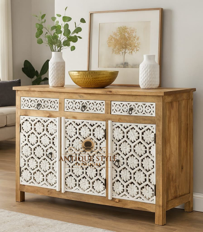 This striking four-door sideboard blends warm natural Mango Wood with intricate distressed white jali carving for a refined bohemian statement. Featuring coordinating top drawers and expansive hidden storage, it offers both visual lightness and everyday functionality. Its two-tone finish, solid wood build, and ring hardware make it ideal for dining rooms and living areas seeking global, rustic, or eclectic charm.