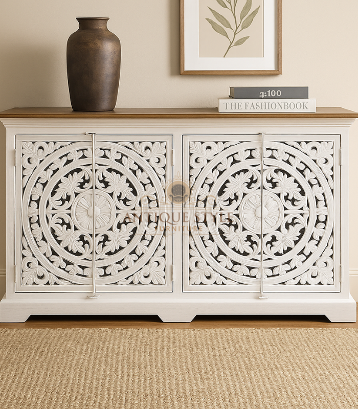 This elegant sideboard showcases deep circular floral carving beautifully balanced with a clean two-tone finish. Crafted from solid Mango Wood, its natural tabletop contrasts gracefully with the soft white body. With generous drawers and cabinet storage, it serves as a stunning functional centerpiece for dining rooms, living spaces, or luxury interiors.