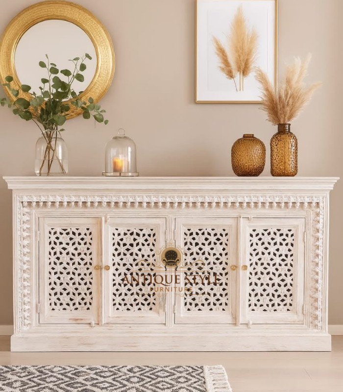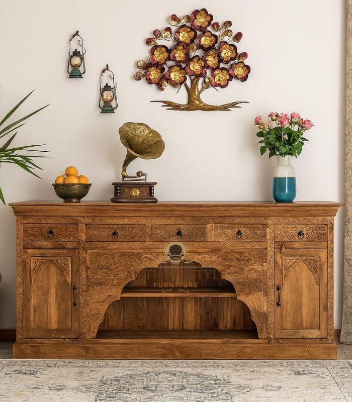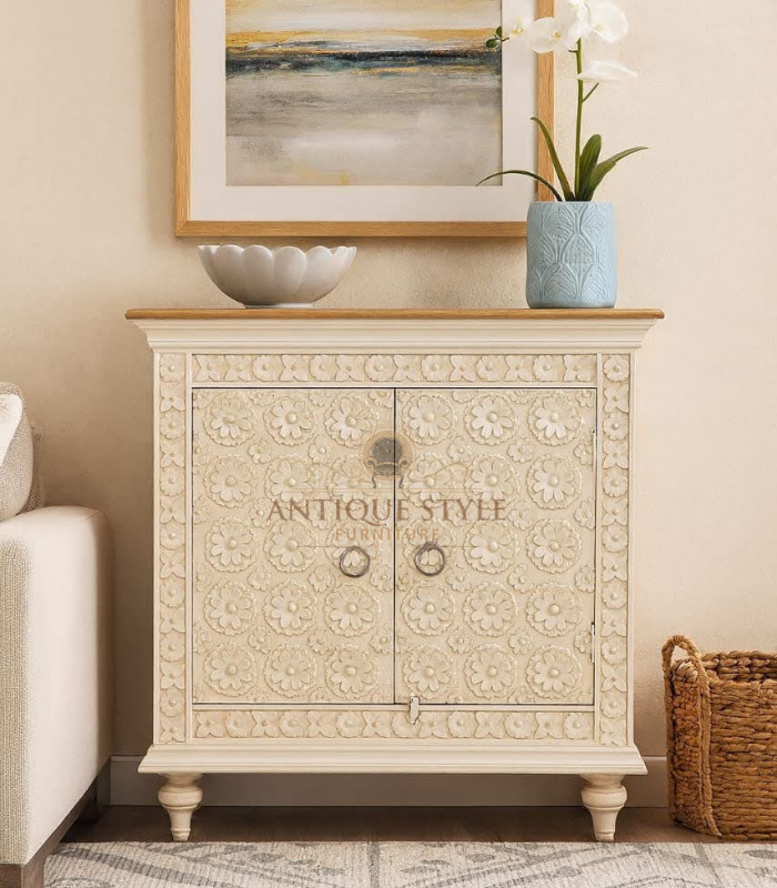 Intricate Hand-Carved Design: Beautiful floral carvings on the twin doors add rich texture and artisanal sophistication.
