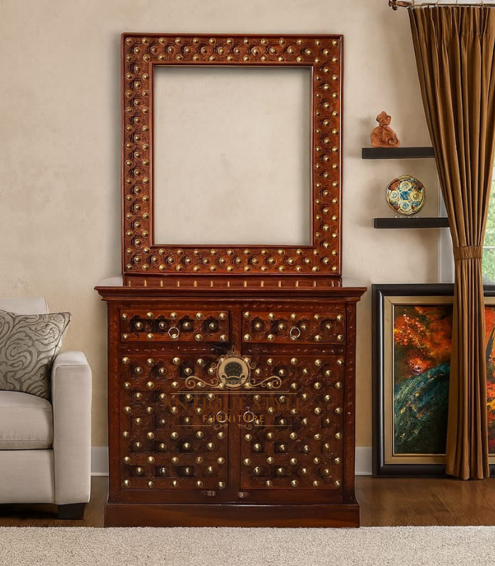 Decorative Metallic Hardware: Ornate metal handles and framed borders enhance the traditional appeal.